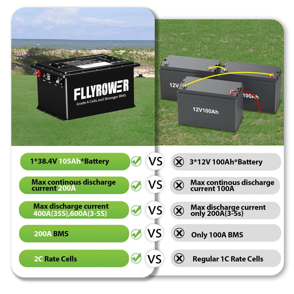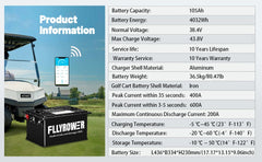 Transform your golf cart’s performance with the FLLYROWER 36V (38.4V) 105Ah Lithium Conversion Kit. This isn't just a battery; it’s a complete power overhaul designed to replace heavy, high-maintenance lead-acid banks. Engineered with an industry-leading 200A Smart BMS, this unit handles the high-torque demands of hill climbing and heavy acceleration with a 400A peak surge capability (35 seconds), ensuring your cart never cuts out when you need power most.