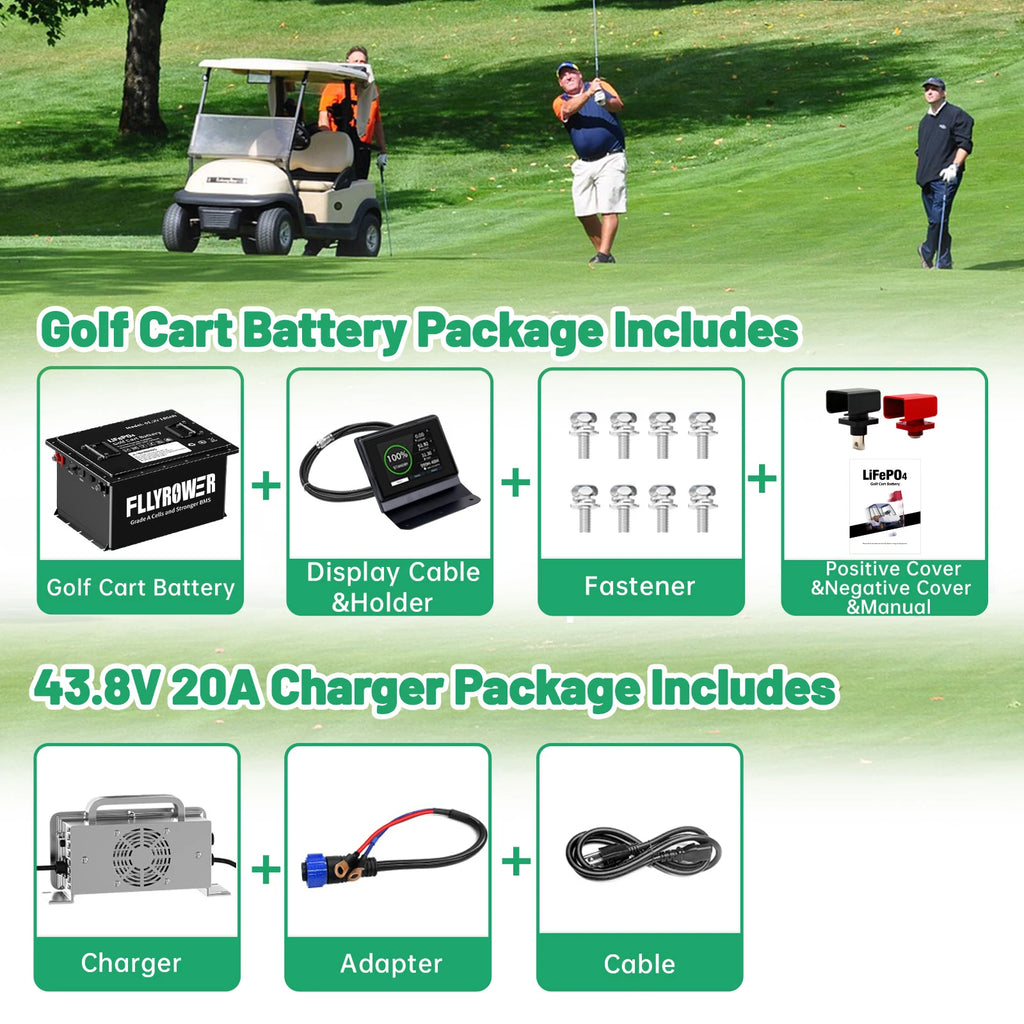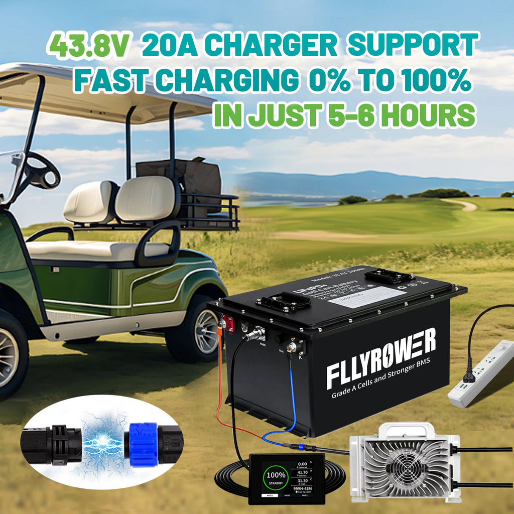 Weighing 70% less than a traditional 36V lead-acid set, the FLLYROWER pack instantly increases your cart's speed and range while reducing wear on your suspension and brakes. With Grade A+ LiFePO4 Cells rated for over 8000 cycles, this battery provides a 10-year service life. Monitor your energy in real-time via the included 2.8" LCD Touch Screen or through the Bluetooth smartphone app, giving you precise "fuel gauge" accuracy for total peace of mind on the course or the trail.